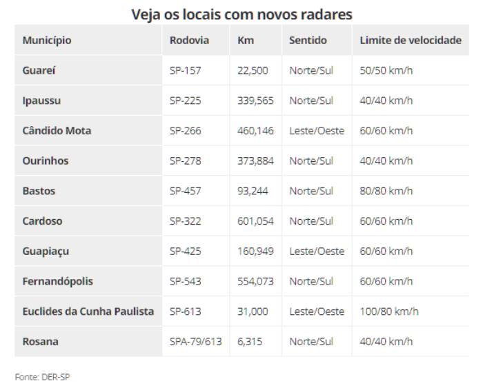 Nesta terça-feira (30), mais 10 radares começaram a operar nas regiões de Presidente Prudente, Bauru, São José do Rio Preto e Itapetininga, segundo informou o Departamento de Estradas de Rodagem (DER-SP), órgão vinculado à Secretaria de Meio Ambiente, Infraestrutura e Logística (Semil).