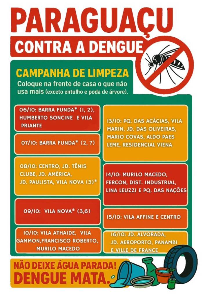 A iniciativa é organizada pela Secretaria Municipal de Saúde, por meio da Vigilância em Saúde, em parceria com a Secretaria de Obras, e tem como objetivo eliminar criadouros do mosquito Aedes aegypti, transmissor da dengue, zika e chikungunya.