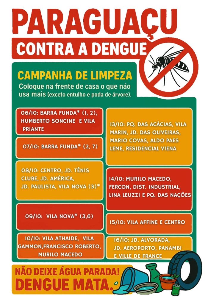 A administração municipal reforça que as equipes não recolherão entulhos de construção nem restos de poda de árvores, pois o foco da campanha é eliminar exclusivamente os criadouros do mosquito transmissor da dengue, zika e chikungunya.
