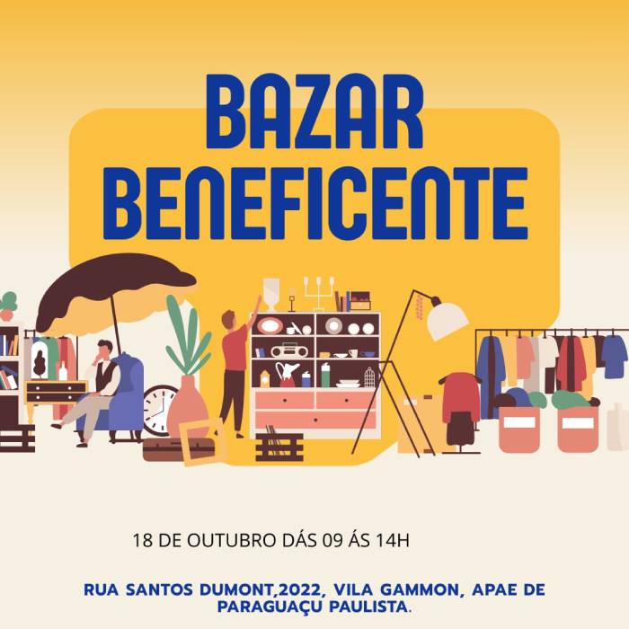 A APAE de Paraguaçu Paulista promove no dia 18 de outubro (sábado) um Bazar Beneficente com a finalidade de arrecadar recursos para manutenção da entidade.