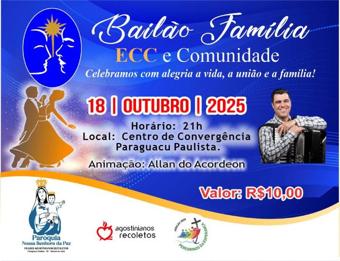 A partir das 20h, no Centro de Convergência Turístico, acontece o animado bailão do Encontro de Casais com Cristo (ECC), com show de Allan do Acordeon.