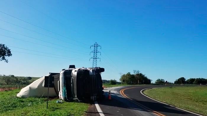 Carreta tomba ao fazer a curva em rodovia de Paraguaçu Paulista