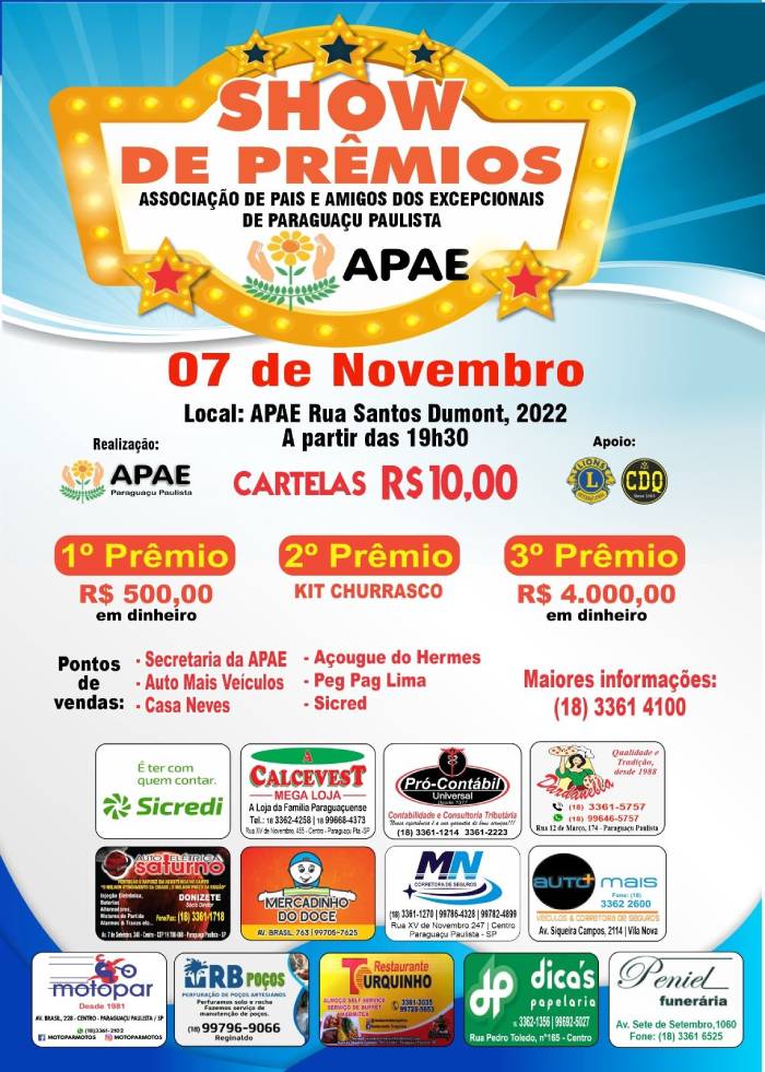 A APAE de Paraguaçu Paulista promove no dia 7 de novembro o seu tradicional Show de Prêmios. Serão sorteados R$500,00 em dinheiro no 1º prêmio, um kit churrasco no 2º prêmio e R$4 mil em dinheiro no 3º prêmio.