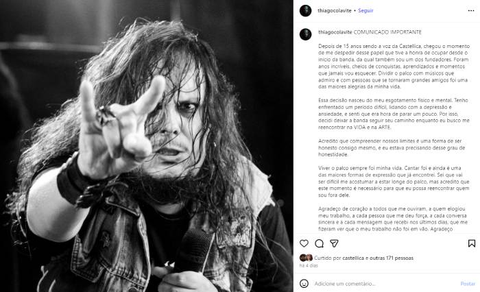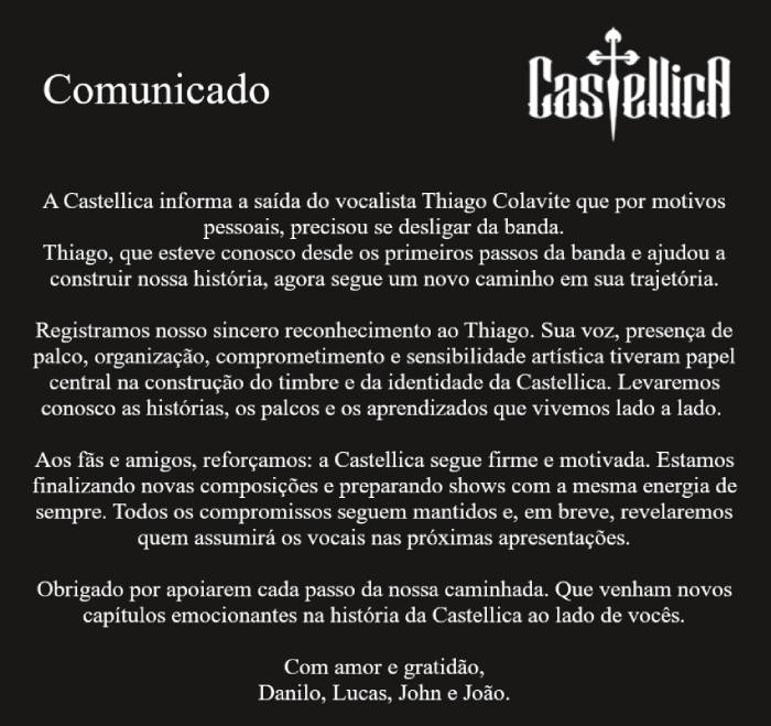 O músico Thiago Colavite também usou as redes sociais para falar sobre seu desligamento do grupo. Ele destacou que depois de 15 anos sendo a voz da Castellica, chegou o momento de se despedir desse papel que teve a honra de ocupar desde o início da banda, da qual também é um dos fundadores. “Foram anos incríveis, cheios de conquistas, aprendizados e momentos que jamais vou esquecer. Dividir o palco com músicos que admiro e com pessoas que se tornaram grandes amigos foi uma das maiores alegrias da minha vida”, destacou.