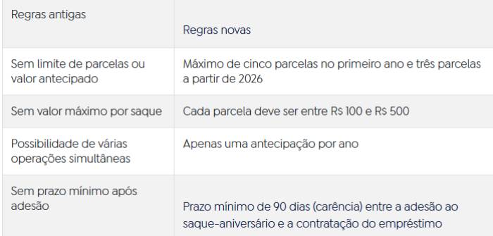As novas regras que limitam a antecipação do saque-aniversário do Fundo de Garantia do Tempo de Serviço (FGTS) entraram em vigor neste sábado (1º). A mudança, aprovada pelo Conselho Curador do FGTS e implementada pela Caixa Econômica Federal, altera o funcionamento dos empréstimos que permitem ao trabalhador antecipar valores futuros do fundo.