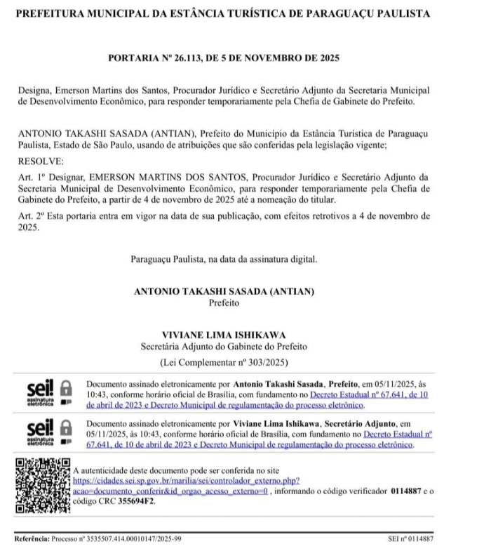 A Prefeitura Municipal de Paraguaçu Paulista publicou na edição desta quinta-feira, dia 6, no Diário Oficial Eletrônico, a nomeação do procurador jurídico e secretário adjunto da Secretaria Municipal de Desenvolvimento Econômico, Emerson Martins dos Santos, como chefe de gabinete do prefeito Antian.