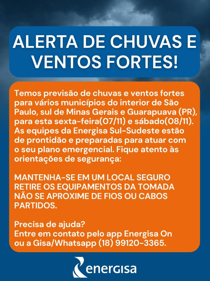 "Dependendo da incidência de raios, intensidade dos ventos e chuvas, pode haver situações de quedas de árvores, galhos ou outros objetos sobre a fiação elétrica, o que pode provocar danos ao sistema elétrico e até mesmo a falta de energia. Por esses motivos, nossos profissionais já estão de prontidão para atuarem imediatamente em qualquer atividade de reparo e recomposição do sistema, a fim de assegurar e restabelecer o fornecimento de energia elétrica com segurança para os clientes da nossa área de concessão", afirma Anderson Rabelo, gerente de Operação da Energisa Sul-Sudeste.