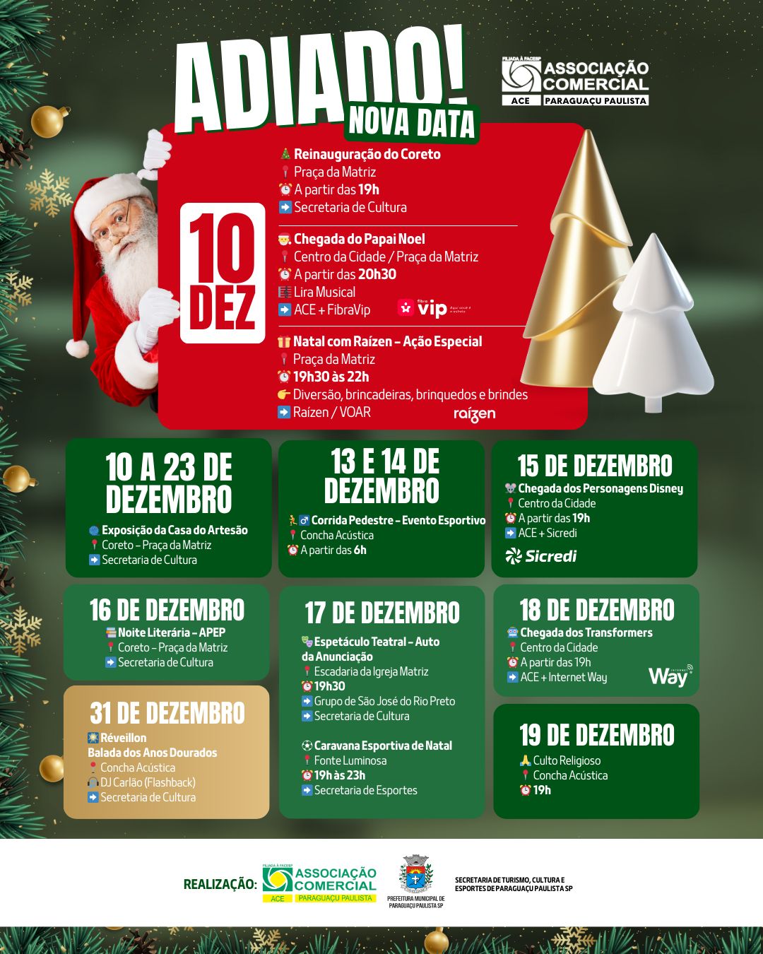 Devido às condições climáticas desta terça-feira, dia 9, a tradicional chegada do Papai Noel, a reinauguração do coreto e as ações especiais da Prefeitura e da Raízen, que aconteceriam hoje (9) foram adiadas para amanhã, quarta-feira, dia 10 de dezembro.