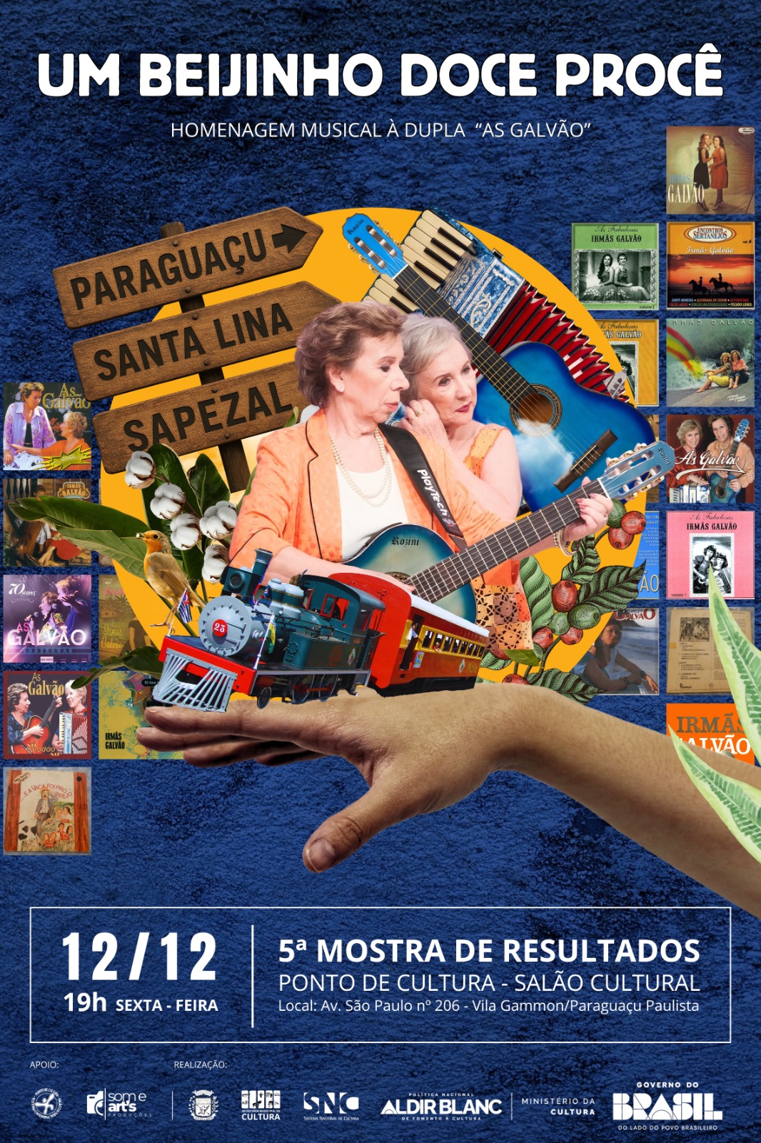 O Ponto de Cultura – Salão Cultural recebe, no dia 12 de dezembro, às 19h, a apresentação musical “Um Beijinho Doce Procê”, homenagem à dupla As Galvão, ícones da música caipira brasileira. O espetáculo integra a programação da 5ª Mostra de Resultados e cumpre a contrapartida pública prevista no Edital nº 001/2024 – Lei Aldir Blanc Paraguaçu Paulista.