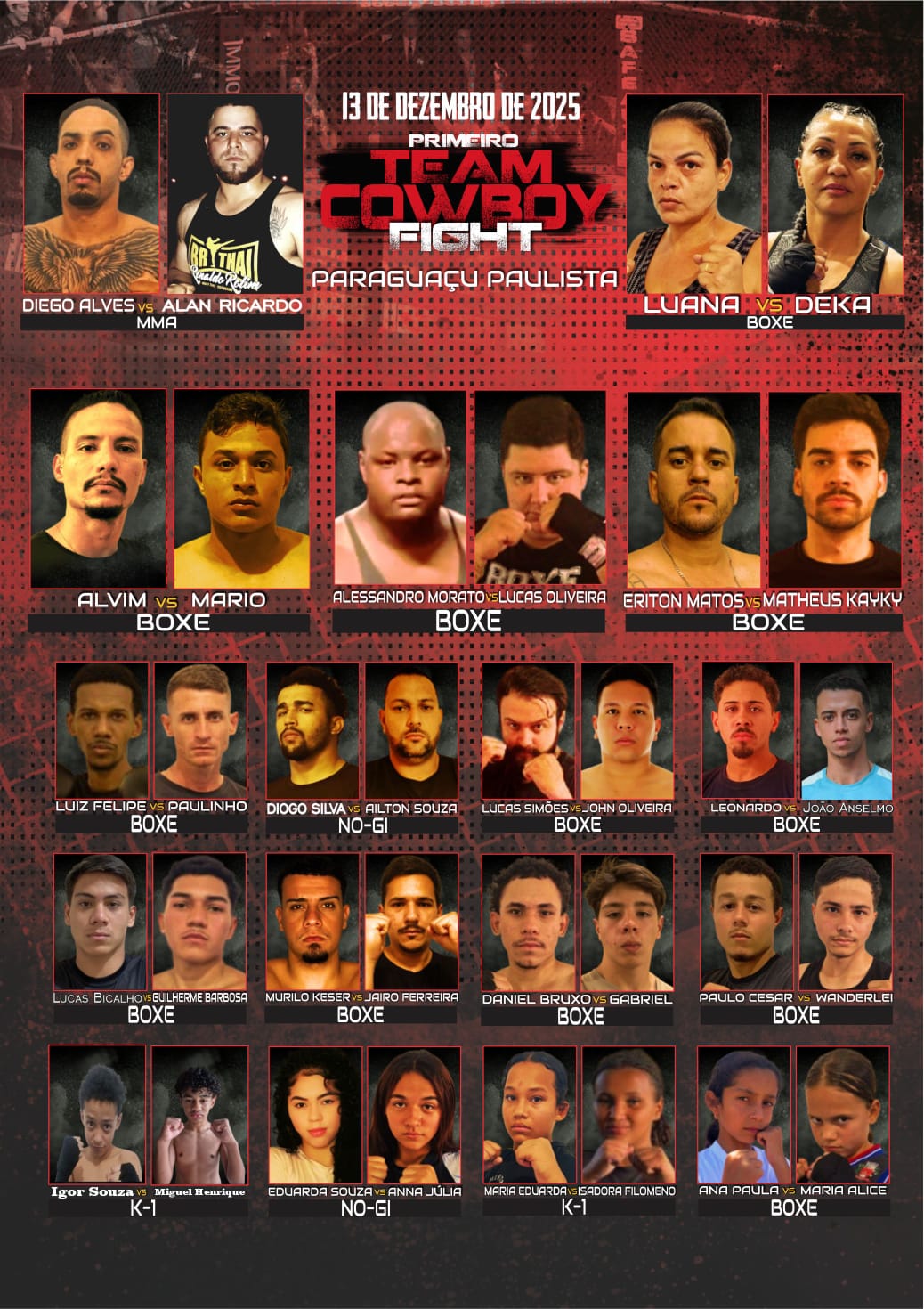Acontece neste sábado, dia 13 de dezembro, no Ginásio de Esportes Sylvio de Magalhães Padilha, em Paraguaçu Paulista, o 1º Team Cowboy Fight, evento de Boxe, Kickboxing, MMA e Submission.