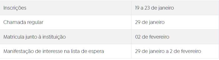De acordo com o edital publicado pelo Ministério da Educação (MEC), o processo seletivo terá somente uma etapa de inscrição para as vagas ofertadas. O resultado da chamada regular será divulgado no dia 29 de janeiro de 2026, e a matrícula junto às instituições começa a partir de 2 de fevereiro de 2026.