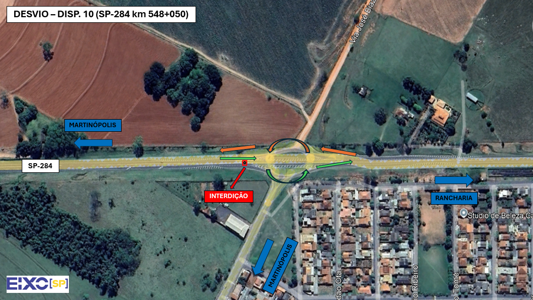 A Eixo SP Concessionária de Rodovias dará continuidade nesta quarta-feira, 14, de mais uma etapa de obras de melhorias na SP 284 - Rodovia Prefeito Homero Severo Lins, em Martinópolis. Nesta etapa, será interditado o viaduto localizado no km 548+050, nas pistas Leste e Oeste, para obras no pavimento.