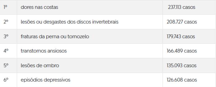 No caso das mulheres, em segundo lugar, aparecem os transtornos ansiosos (118.517), seguidos pelas lesões ou desgastes dos discos intervertebrais (98.305). Já no caso dos homens, em segundo fica a dorsalgia (115.527) e, em terceiro lugar, também as lesões ou desgastes dos discos intervertebrais (110.422), como as hérnias.