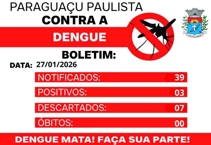 A Secretaria de Saúde da Prefeitura Municipal de Paraguaçu Paulista, com informações da Vigilância em Saúde e Núcleo de Informações Estratégicas em Saúde do Estado de São Paulo, compartilha com a população o boletim atualizado dos casos de dengue no município. Em 2026, até o momento, são três casos positivos, sete negativos, e 39 casos notificados. O cenário é bem melhor que o de 2025, que no mesmo período já tinham sido confirmados 16 casos. Grande parte deste resultado mais favorável deve-se às campanhas de prevenção e da colaboração de cada um e de diversos setores da sociedade. A diminuição dos casos, mesmo em um início de ano mais chuvoso que o anterior, reforça a importância da prevenção.