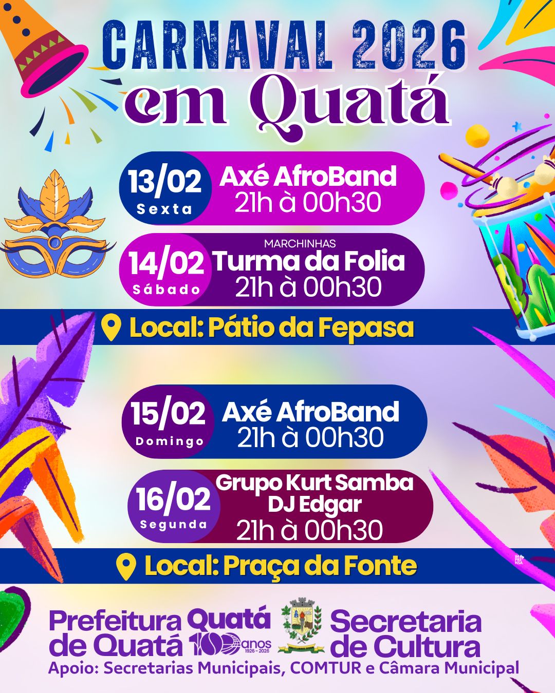 Em Quatá, uma programação foi preparada com shows e marchinhas nos dias 13 e 14, no Pátio da Fepasa, e dias 15 e 16 na Praça da Fonte.