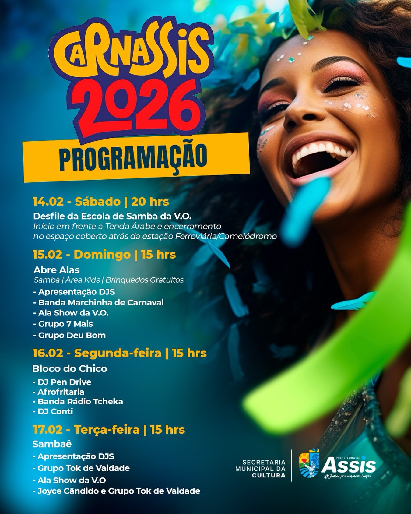 Em Assis, a programação do Carnassis 2026 começa no sábado, dia 14, e vai até a terça-feira, dia 17. Haverá desfile da Escola de Samba Unidos da Vila Operária, shows, área kids para as crianças e muita animação com blocos. A festa acontece no espaço coberto atrás da Estação Ferroviária e do Camelódromo, na Praça da Bandeira.