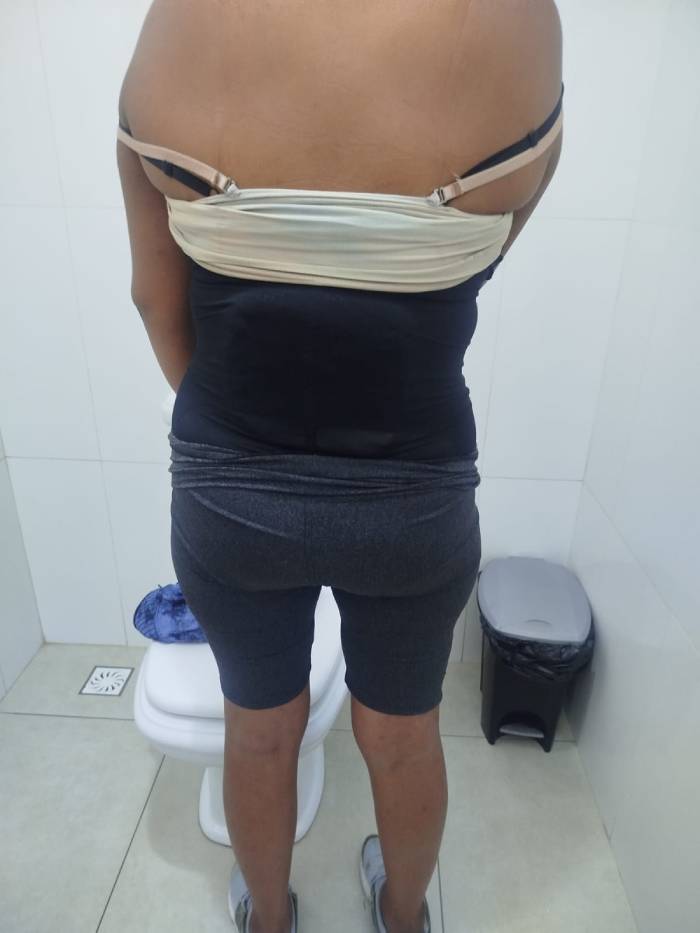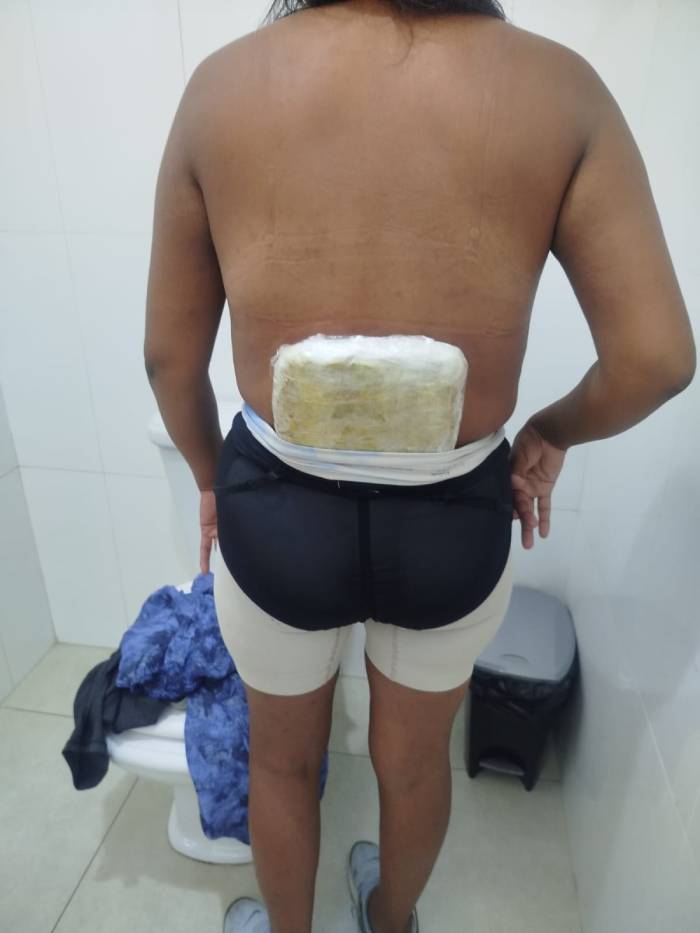 Durante a fiscalização no ônibus, duas passageiras que ocupavam as poltronas 19 e 20 apresentaram respostas desconexas. Ao serem submetidas à busca pessoal, os policiais localizaram 02 invólucros com cocaína, acondicionados junto às costas, em formato semelhante a placas de colete balístico.