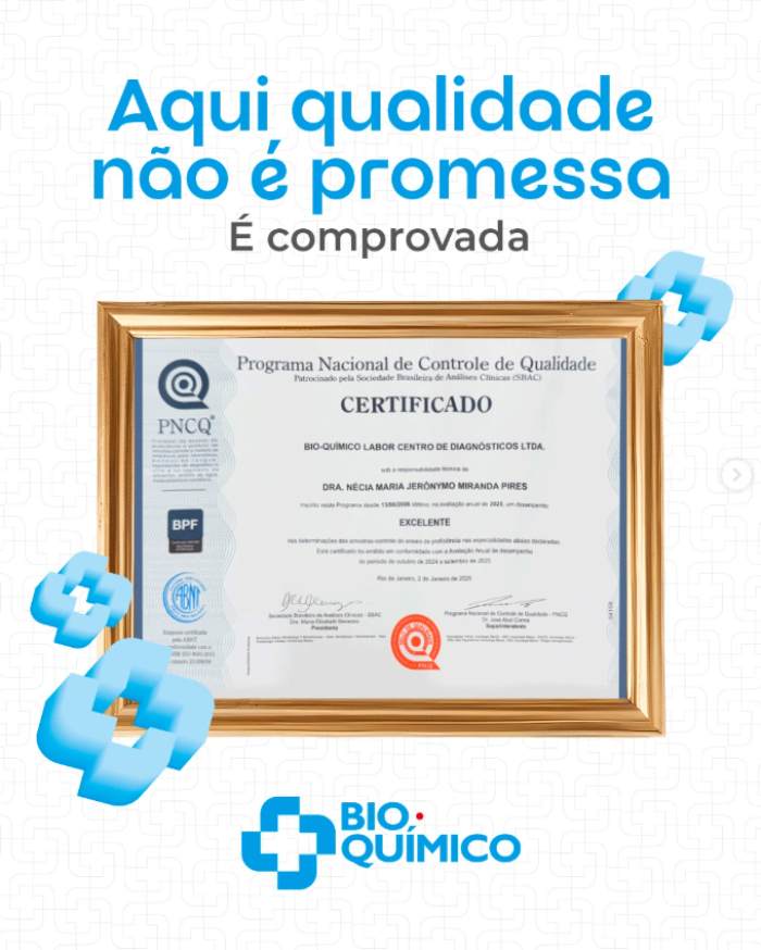Após um ano inteiro de avaliações, o Programa Nacional de Controle de Qualidade (PNCQ) considerou que o Bioquímico segue padrões rigorosos de controle de qualidade, garantindo resultados confiáveis e seguros para pacientes e médicos.