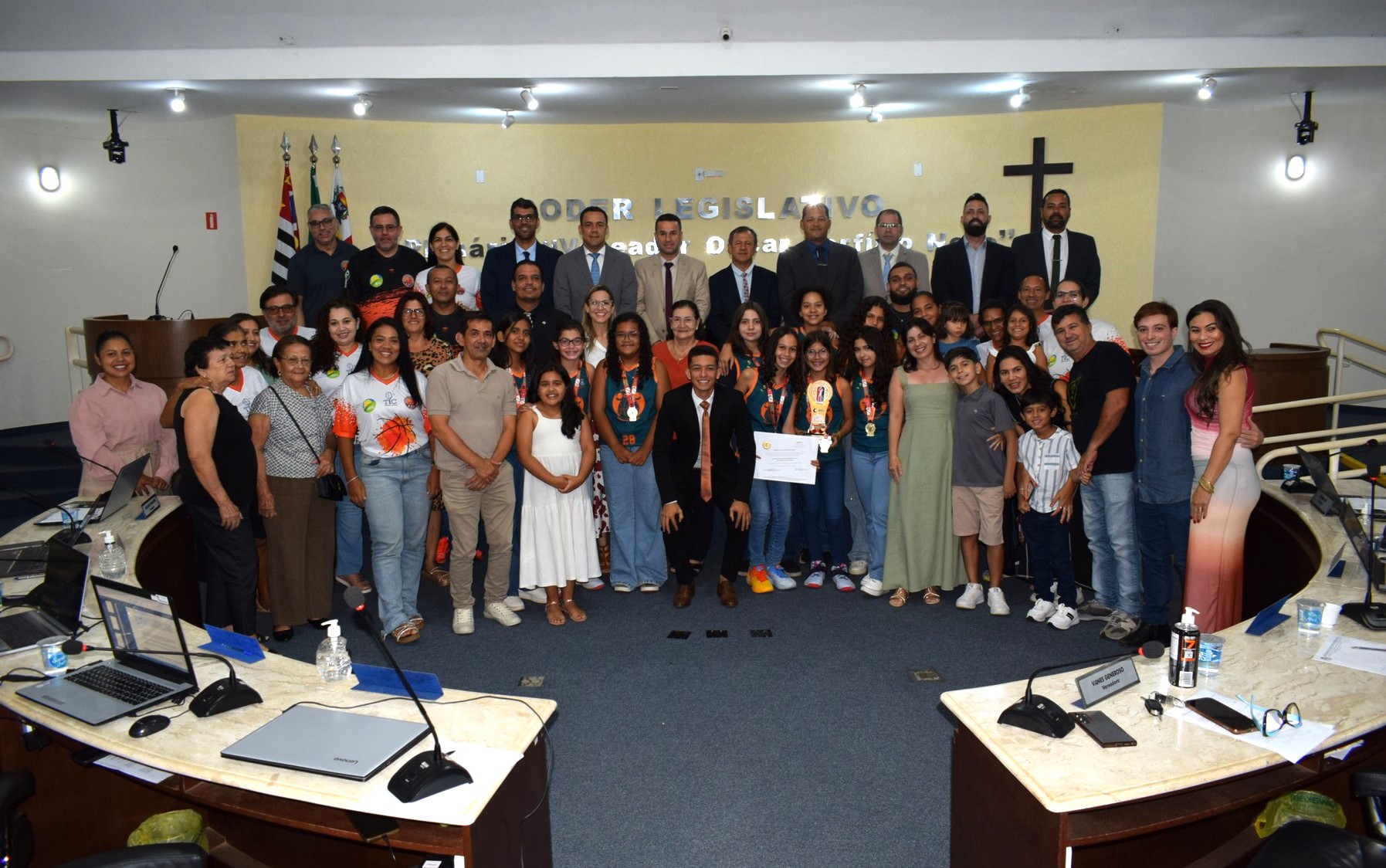 Equipe homenageada com seus familiares durante a Sessão desta segunda-feira. Foto: Câmara/Divulgação