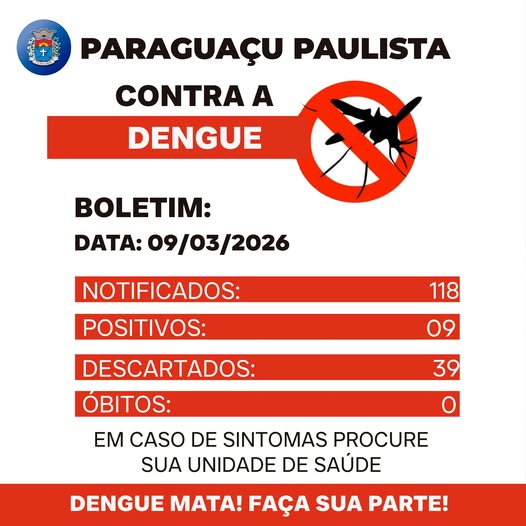 Apenas 9 dos 344 casos confirmados de dengue em 2026 na região do Grupo de Vigilância Epidemiológica (GVE) de Assis ocorreram em Paraguaçu Paulista, aponta o boletim da Secretaria de Saúde da Prefeitura Municipal, com dados da Vigilância em Saúde e Núcleo de Informações Estratégicas de Saúde (NIES) do governo do estado. O boletim ainda registra 39 casos com resultado negativo e total de 118 notificações desde o início do ano.