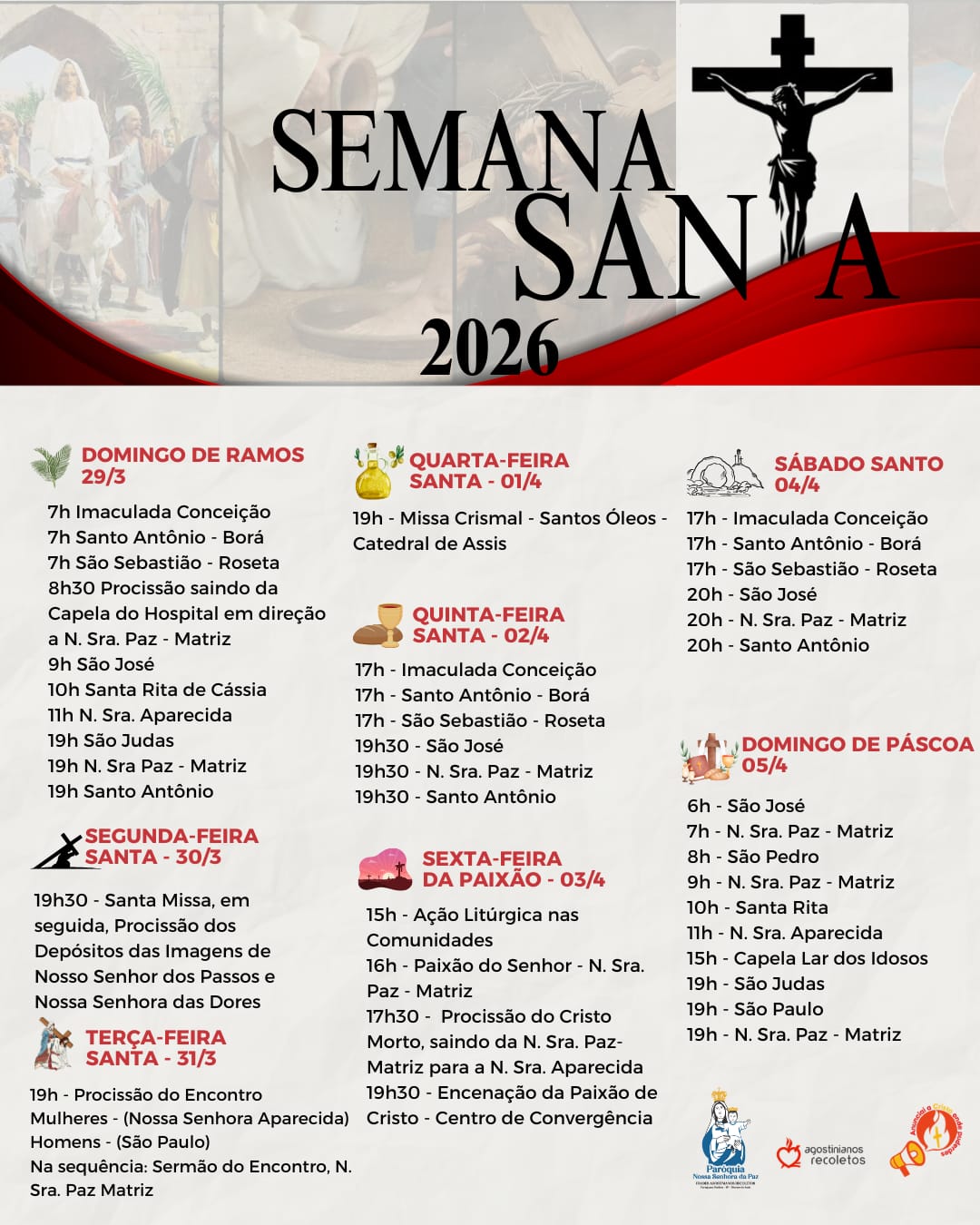 A Paróquia Nossa Senhora da Paz, juntamente com os Freis da Ordem dos Agostinianos Recoletos (OAR), convida toda a comunidade para vivenciar a Semana Santa 2026, um tempo especial de fé, oração e reflexão.