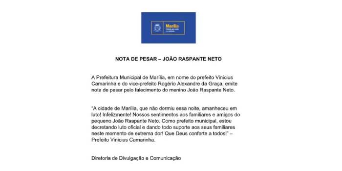 O velório da criança está marcado para às 16h30, no Cemitério da Saudade. A prefeitura de Marília decretou luto de um dia na cidade e divulgou uma nota de pesar nas redes sociais.
