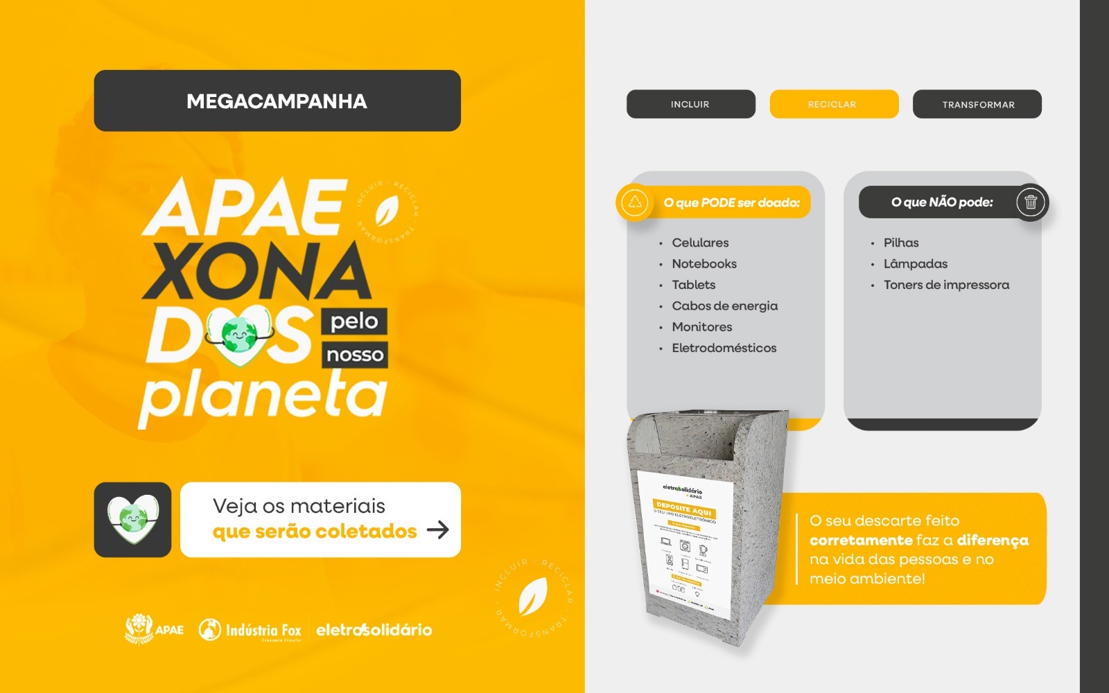A iniciativa acontece por meio de parceria com a Empresa Fox e consiste na arrecadação de eletroeletrônicos na cidade, que deverão ter seu descarte feito de forma correta, contribuindo para o meio ambiente e bem estar do planeta.