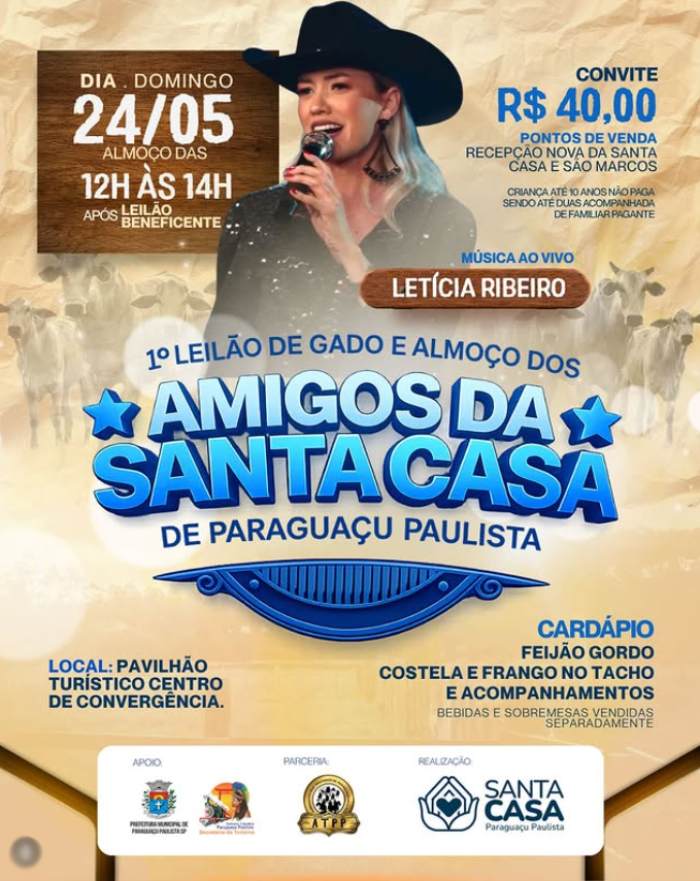 No dia 24 de maio (domingo), acontece o 1º Leilão de Gado e Almoço dos Amigos da Santa Casa de Paraguaçu Paulista. O evento, que une solidariedade, tradição e muita música boa, será realizado no Pavilhão Turístico do Centro de Convergência, à partir de 12h (almoço), com o leilão previsto para começar às 14h.