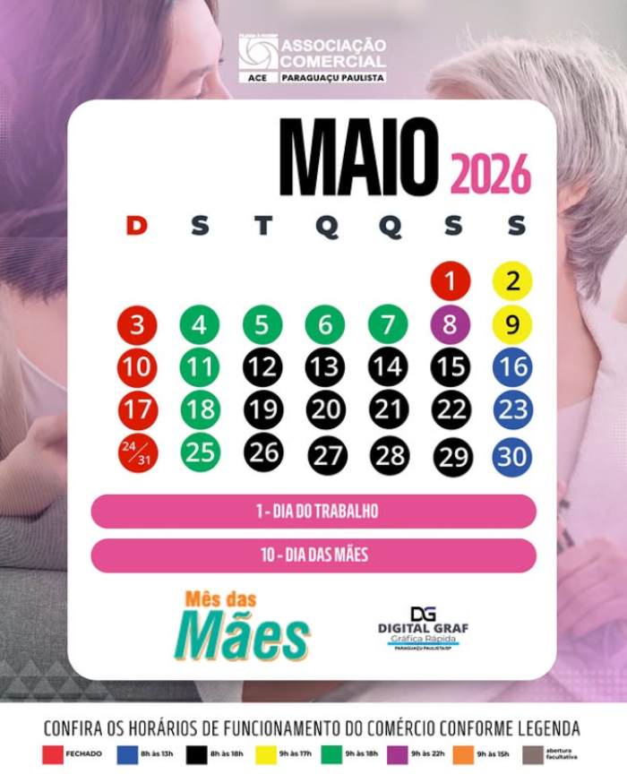Para facilitar as compras de Dia das Mães, a Associação Comercial preparou um calendário especial, com atendimento em horários estendidos até as 17h nos dois primeiros sábados, do mês, visando recepcionar os consumidores. Além disso, na sexta-feira, dia 8 de maio, as lojas terão atendimento estendido até às 22h.