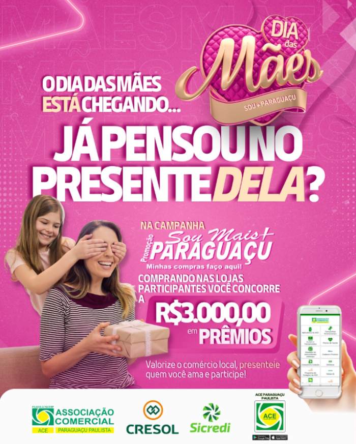 Com a finalidade de incentivar os clientes a comprarem nas lojas de Paraguaçu Paulista, a Associação Comercial vai sortear R$3 mil em prêmios na Promoção Sou Mais Paraguaçu. São quase 40 empresas participantes desta etapa, com a entrega de cupons QR Code que dão direito a participação no sorteio.